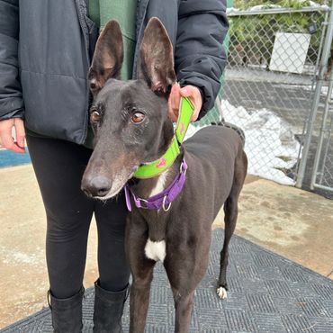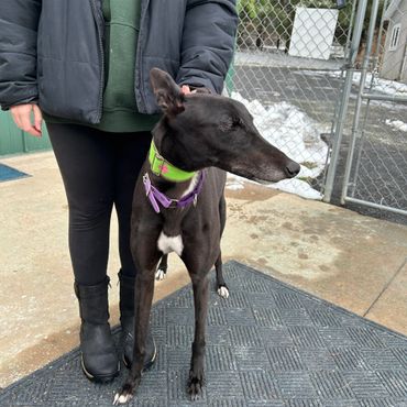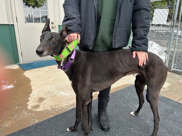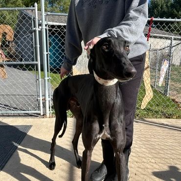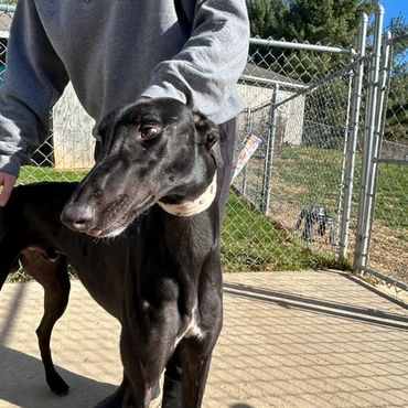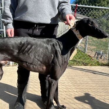 Bodie was returned to us through no fault of his own his owner became ill and was no longer able to care for him. Bodie is very a handsome sweet and outgoing boy. He is NOT good with children. Bodie is good around other greyhounds and would benefit with being in a home with another Greyhound or someone that is at home the majority of the time as he does have a little bit of separation anxiety because, he becomes very attached to his owner. He is good in a crate when he is left alone for short periods of time.